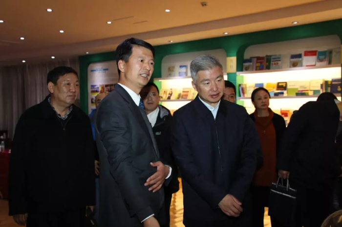 西藏阜康醫療股份有限公司黨委書記、董事長王斌向莊嚴書記介紹"阜康企業文化”