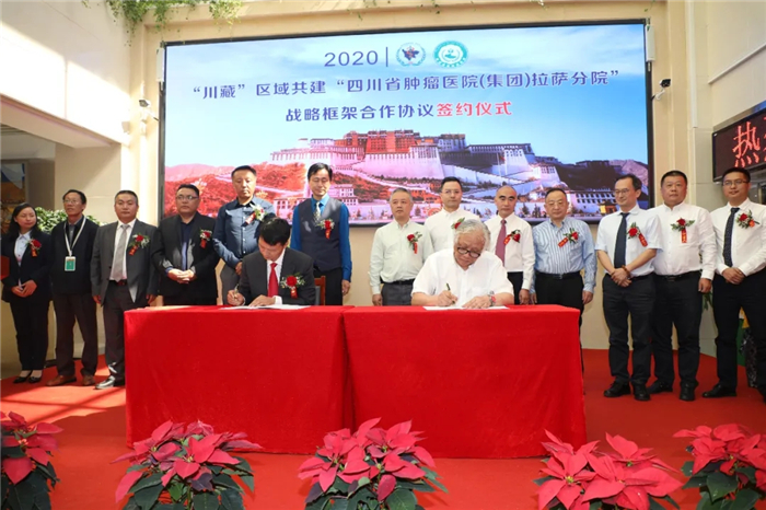 四川省腫瘤醫院黨委書記郎錦義,西藏阜康醫療股份有限公司黨委書記、董事長王斌代表雙方共同簽署《川藏區域共建四川省腫瘤醫院(集團)拉薩分院戰略框架合作協議》,隨后郎錦義書記向王斌董事長進行了授牌。